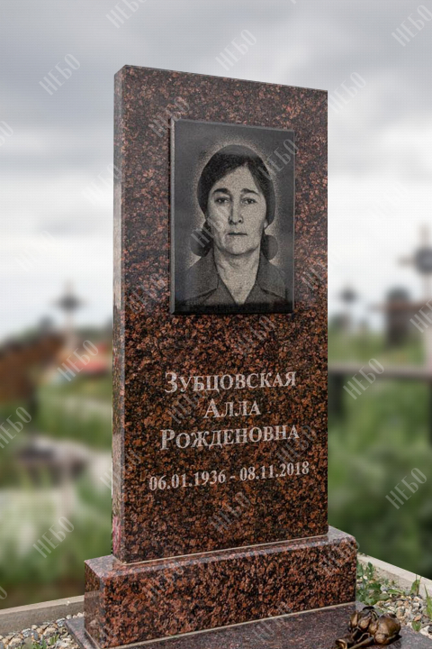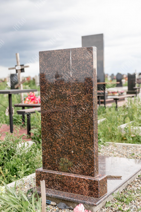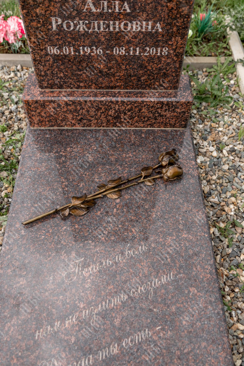 Памятник без креста с прямой стелой и закрытым надгробием выполнен с использованием декоративных элементов. Объемные розы медного оттенка, украшающие надгробную плиту, дополняют композицию ритуального изделия и отлично сочетаются с насыщенным коричневым цветом гранита. Закрытое надгробие имеет правильную прямоугольную форму, ровную сплошную поверхность, что значительно упрощает уход за ритуальным изделием. Размеры памятника проработаны специалистами с учетом имеющейся нагрузки и визуального восприятия. Такой подход гарантирует долговечность и исключает искажения памятника.